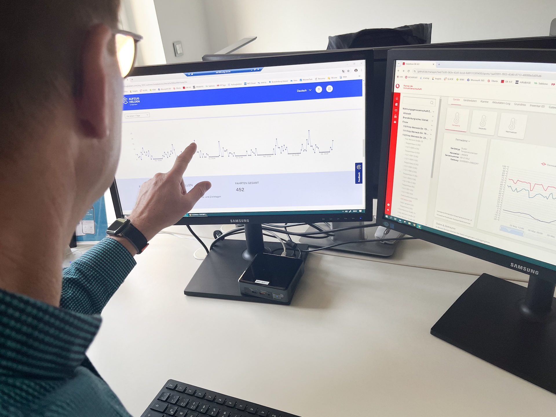 „Ich hab‘ Strom übrig. Brauchst du?“ Das könnte eine Anwendung sein, wenn unsere Häuser selbst Strom produzieren und sich gegenseitig Kapazitäten frei geben. Dass sie untereinander kommunizieren, stellen wir mit eigenen Campus-Netzen sicher. Daten liefern Sensoren und smarte Zähler, die wir bereits an allen relevanten Anlagen installiert haben. Sie liefern ihre Daten regelmäßig an eine Plattform und sind die Grundlage für Entscheidungen, wenn es zum Beispiel um die Anschaffung neuer Anlagen geht. Der Glasfaser-Ausbau bis in die Wohnungen ist ein weiterer großer Schritt, um alle Häuser zukunftsfit zu machen. Mit dem Bau unserer eigenen Campus-Netze behalten wir des Zepter des Handelns in der Hand.